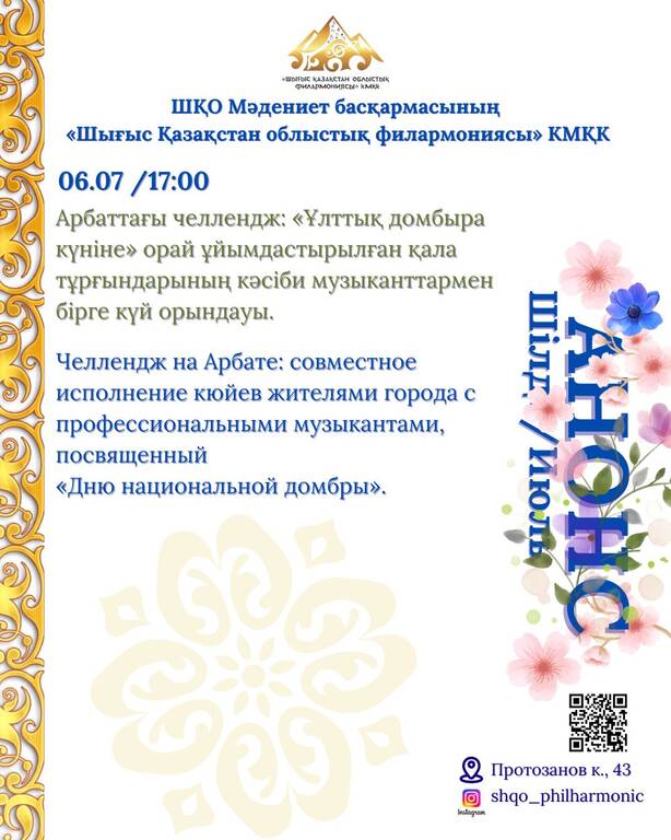 Шілде айының іс-шаралар анонсы Өтетін орны: ШҚО филармониясының концерт залы Протозанов к., 43
