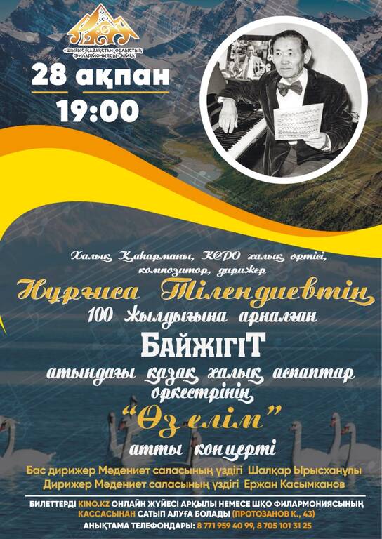 28 ақпан күні Халық Қаһарманы, КСРО халық әртісі, композитор, дирижер Нұрғиса Тілендиевтің 100 жылдығына арналған Байжігіт атындағы қазақ халық аспаптар оркестрінің «Өз елім» атты концерті өтті.