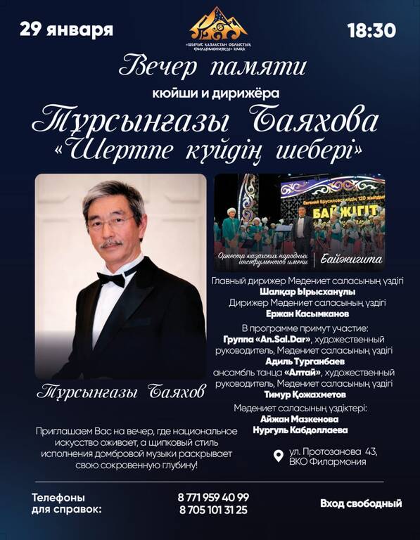 28 ақпан, сағат 19:00 Композитор, дирижер Нұрғиса Тілендиевтің 100 жылдық мерейтойына арналған Байжігіт атындағы қазақ халық аспаптар оркестрінің «Өз елім» атты концертіне шақырамыз