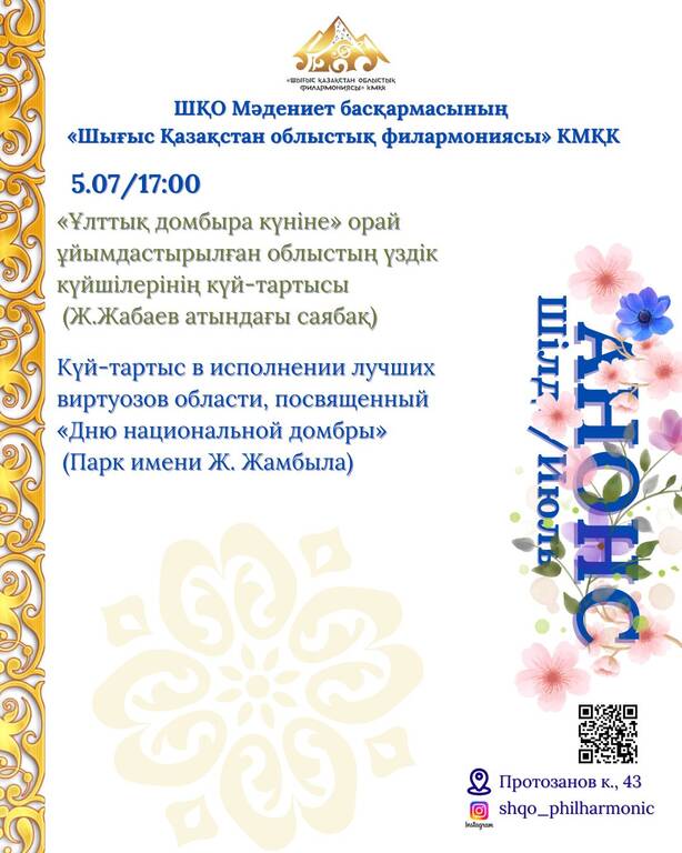 Шілде айының іс-шаралар анонсы Өтетін орны: ШҚО филармониясының концерт залы Протозанов к., 43